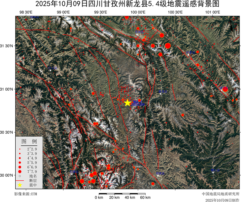 据中国地震台网测定,北京时间2025年10月09日13时17分在四川甘孜州新龙县(纬度30.84度, 经度99.86度)发生5.4级地震,震源深度10千米。