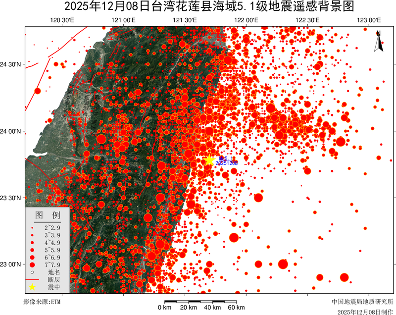 据中国地震台网测定,北京时间2025年12月08日19时24分在台湾花莲县海域(纬度23.78度, 经度121.70度)发生5.1级地震,震源深度20千米。