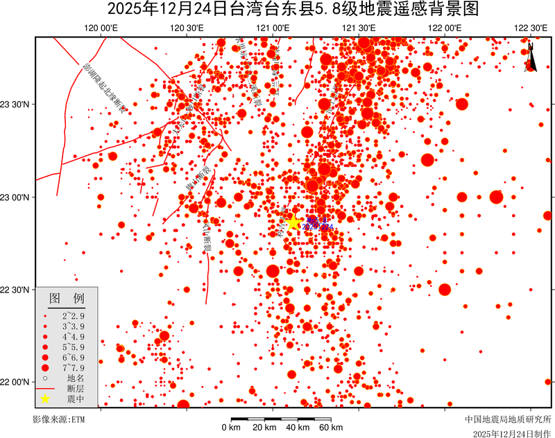 据中国地震台网测定,北京时间2025年12月24日17时47分在台湾台东县(纬度22.86度, 经度121.12度)发生5.8级地震,震源深度10千米。