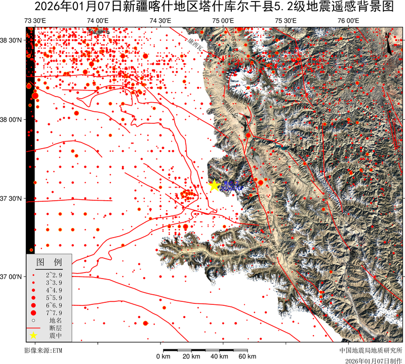 据中国地震台网测定,北京时间2026年01月07日03时17分在新疆喀什地区塔什库尔干县(纬度37.58度, 经度74.93度)发生5.2级地震,震源深度10千米。