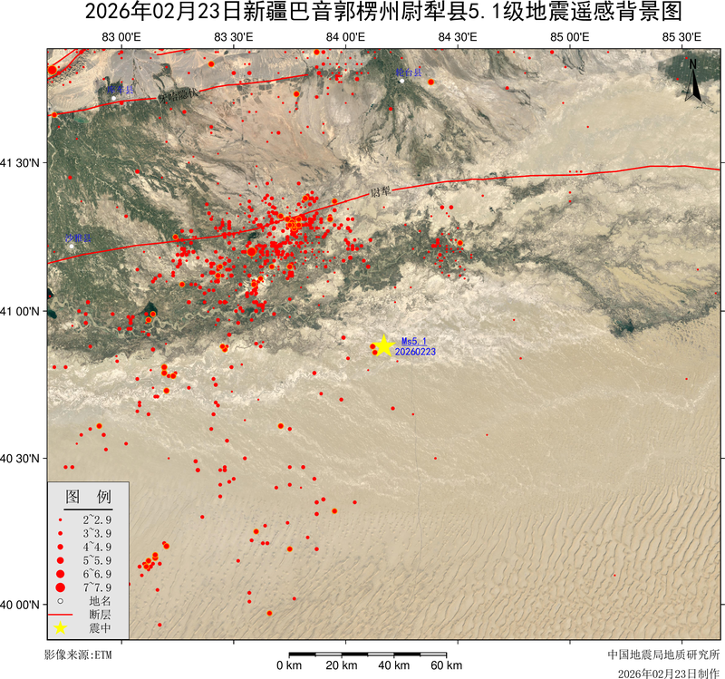 据中国地震台网测定,北京时间2026年02月23日12时12分在新疆巴音郭楞州尉犁县(纬度40.88度, 经度84.17度)发生5.1级地震,震源深度15千米。